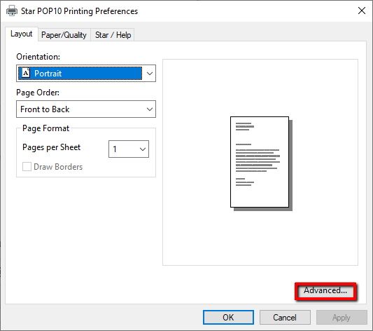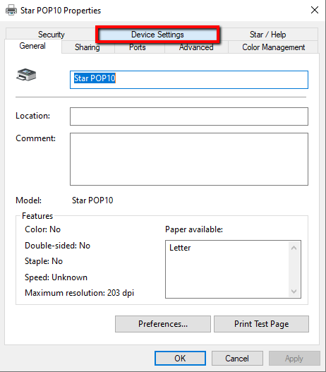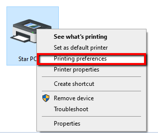 Note: In the event that it appears as Unspecified, update the device drivers from the Device Manager following the instructions listed HERE - Right click on the Star mPOP printer and select Printing Preferences