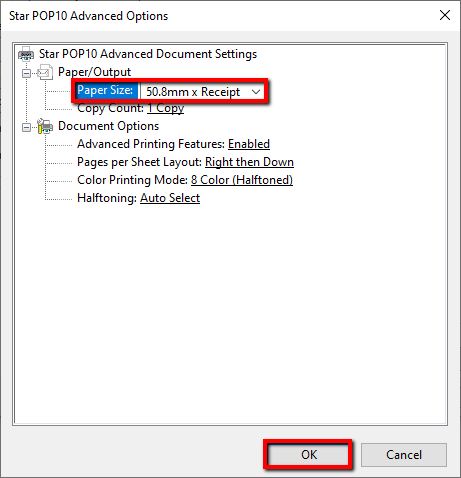 - Tap the drop-down for Paper Size and change this to 54mm x Receipt. Click the Ok button once you have done this. Then click Ok again to exit the screen.