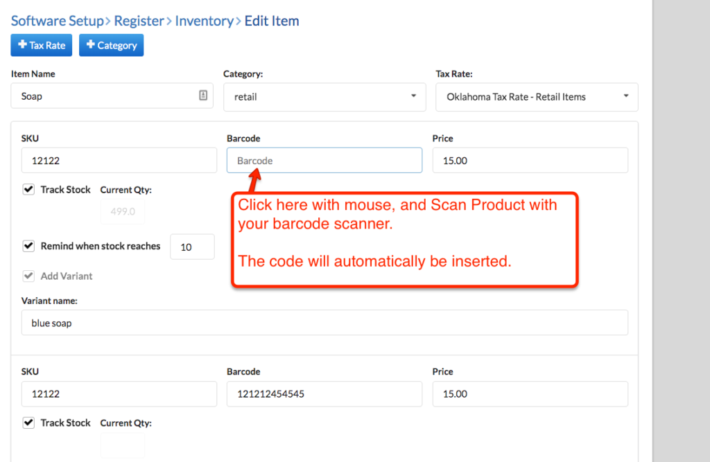 - Now add item details, and when you get to the barcode section, simply click in the barcode field and then scan the product’s bar code: