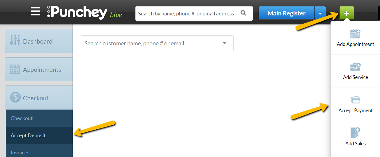 • Navigate to Checkout › Accept deposit (also in Quick MenuAccept payment). Search for the customer and continue.