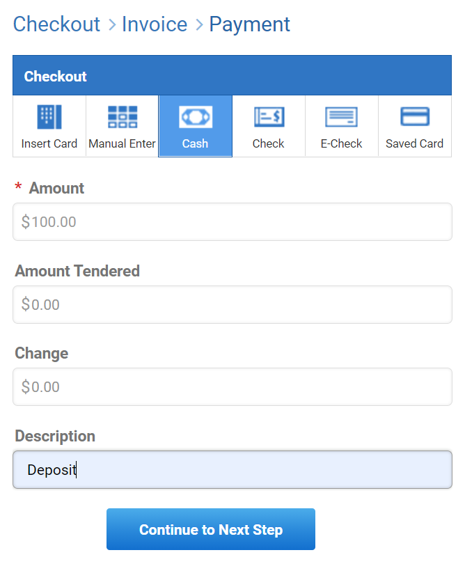 Step 3: Choose the payment method, and enter a description titled: Deposit