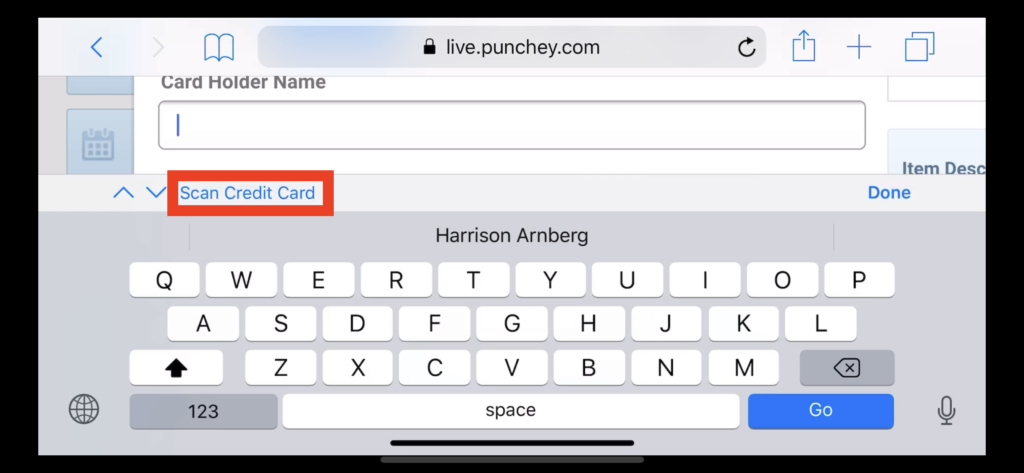 From here, just hold the card under the camera and it will scan. Select “Charge Card” after the information fields are automatically updated.